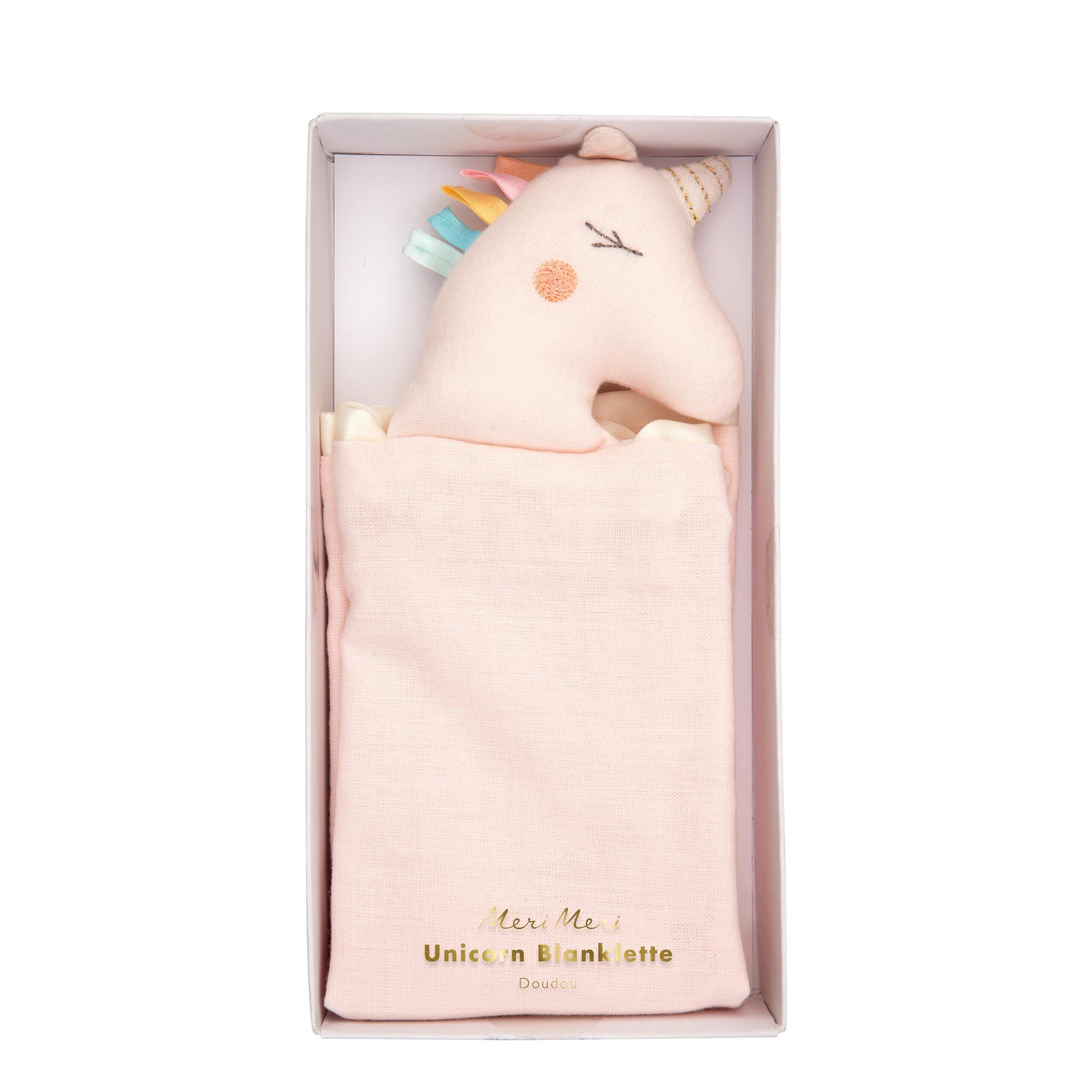 Tillverkad av mjuk 100 % bomull, med söta broderade drag, detta enhörningstäcke är en magisk present för en liten att mysa i.