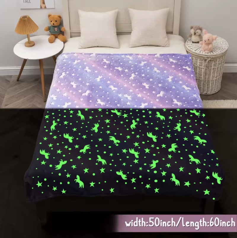 Gör läggdags extra magisk med denna självlysande enhörningsfilt. Filten är tillverkad i mjuk och värmande fleece som ger maximal komfort samtidigt som de lysande enhörningsmotiven skapar en trygg och mysig atmosfär i mörkret.