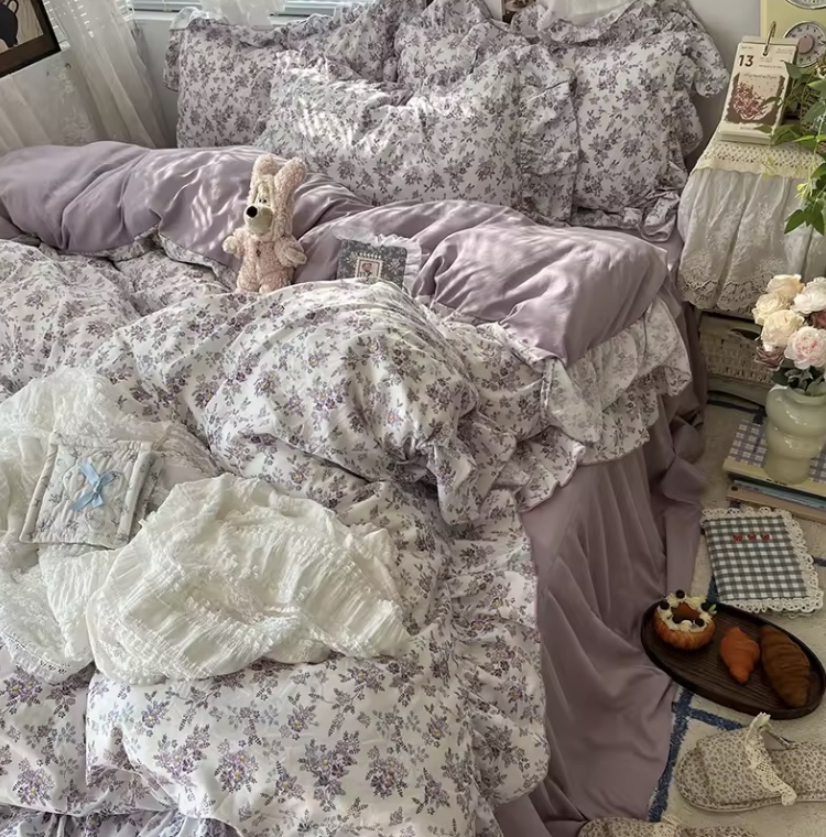 Glöm skrikiga färger – dagens inredningstrender handlar om lugna, jordnära pasteller och mjuka nyanser. Detta bäddset i koreansk prinsessstil kombinerar romantiska volanger med färger som dov lila, mjuk mauve och varma, jordiga toner.