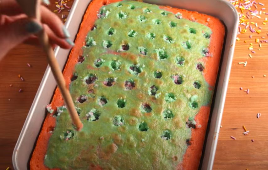 4. Låt kakan svalna något, använd sedan botten av en träslev för att sticka hål över hela kakan.